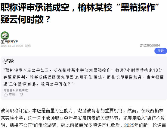榆林这所小学的职称评审乱象,已超越了个案范畴,演变成一场对基层教育治理生态的严峻拷问。它系统性地暴露了程序正义的缺失、监督机制的失灵以及权力运行的失范。当白纸黑字的制度规定敌不过领导的随意打分和口头承诺,当严肃的评优评先成为内部人操纵的游戏,当教师的正当诉求被“推脱、许诺、威慑”三部曲轻松化解,教育的公信力基石正在被侵蚀。